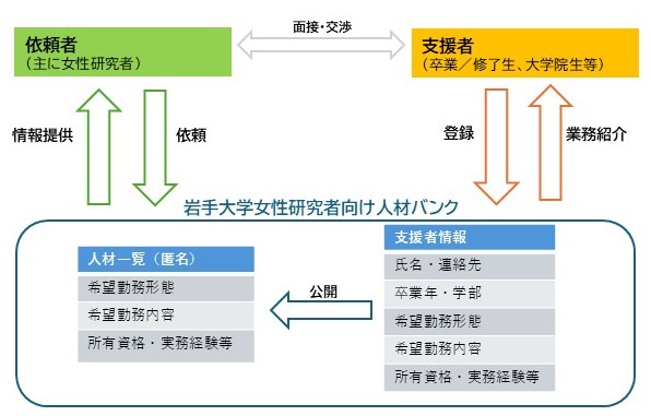 「岩手大学女性研究者支援人材バンク」は、自身の能力・経験を活かしたい本学の卒業生・修了生・大学院在学中の方の情報を登録し、研究支援者などを探している岩手大学の女性研究者(依頼者)に情報提供するシステムです。女性研究者の人材確保の負担を軽減し、研究実績の蓄積を促進することを目的にしています。