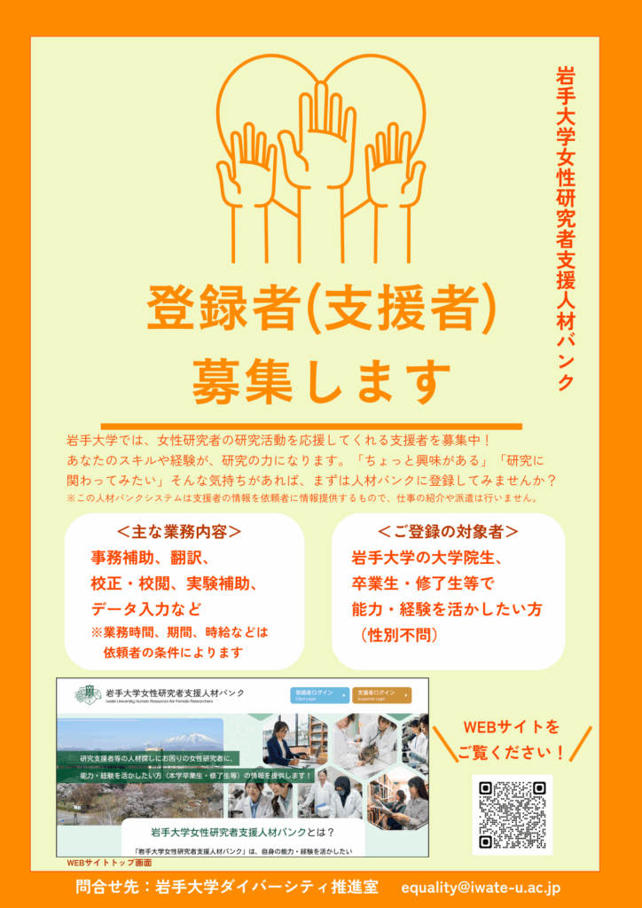 岩手大学の大学院生、卒業生、修了生などの方は、培ったスキルや経験が本学の女性研究者の支援に繋がります!ぜひ支援者にご登録をください。
