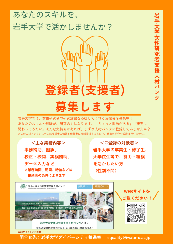 <岩大卒業生・修了生の皆さま>あなたのスキル・経験を大学で活かしませんか?「岩手大学女性研究者支援人材バンク」支援者登録募集中