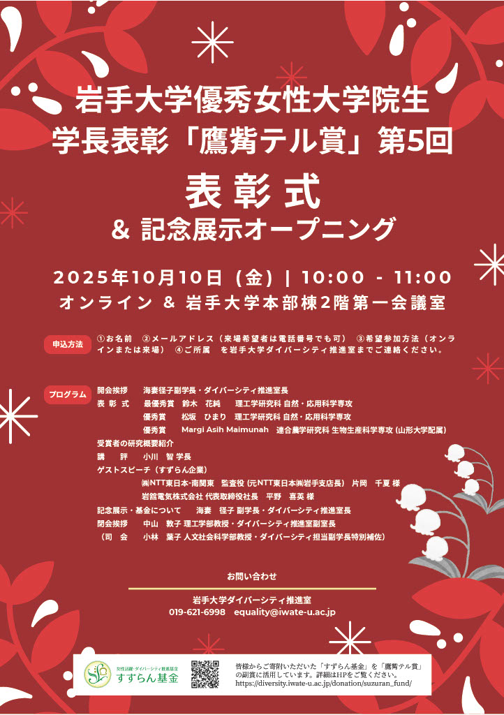 優れた研究活動等を行う女性大学院生を学長が表彰する「岩手大学優秀女性大学院生学長表彰(2021年度より通称「鷹觜テル賞」)の、今年度の受賞者表彰式を開催します。