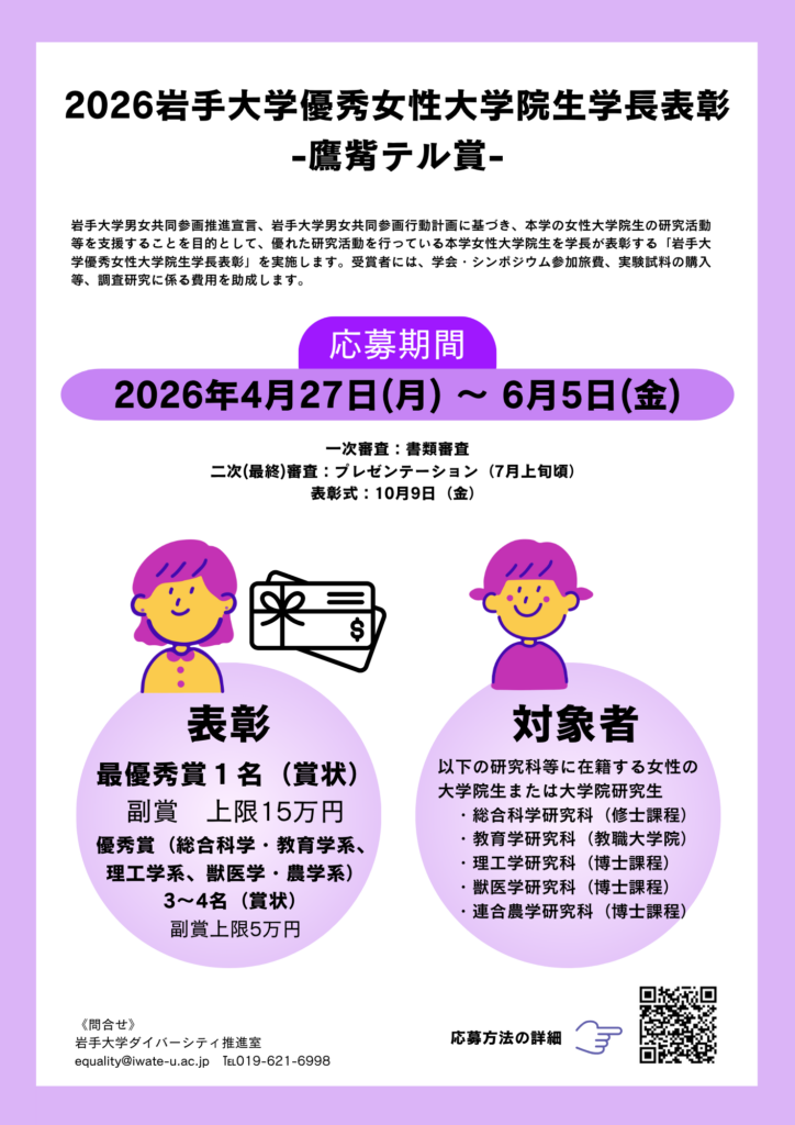 2026年度岩手大学優秀女性大学院生学長表彰(鷹觜テル賞)について(募集)